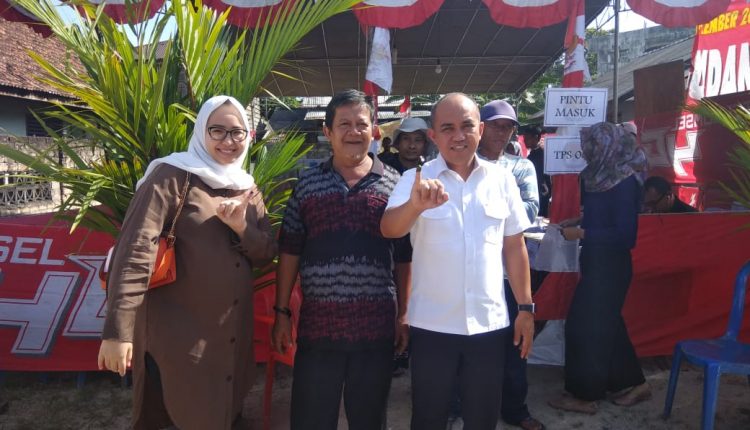 SATUARAHNEWS.COM, PANGKALPINANG—Wali Kota Pangkalpinang Maulan Aklil (Molen) ditemani istrinya Monica Haprinda melakukan pencoblosan Surat suara di TPS 06 dijalan A Yani Pangkalpinang, Rabu 17/4.