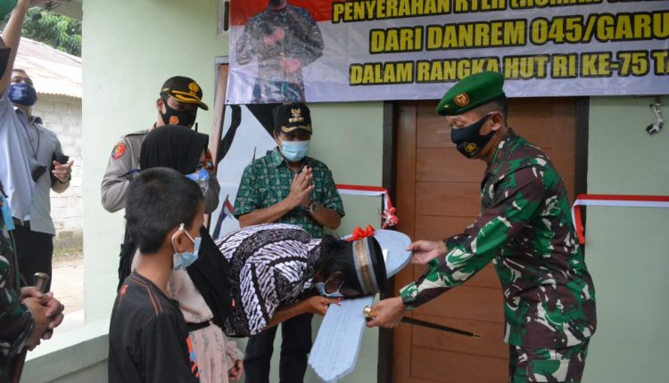 BASKARA BAKTI — Dalam rangka menyambut HUT ke- 75 RI, TNI AD melalui Danrem 045/Gaya Brigjen TNI M. Jangkung Widyanto S.I.P., M. Tr (Han) memberikan bantuan rumah layak huni kepada Suhardi salah satu warga yang berdomisili di Desa Baskara Bakti Kecamatan Namang Kabupaten Bangka Tengah.Sabtu (15/08/2020)