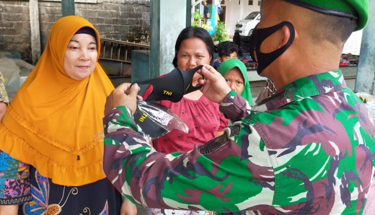 dengan mensosialisasikan protokol kesehatan Covid-19 dan membagikan masker kepada para pengguna jalan dan pengunjung pasar yang tidak memakai masker.