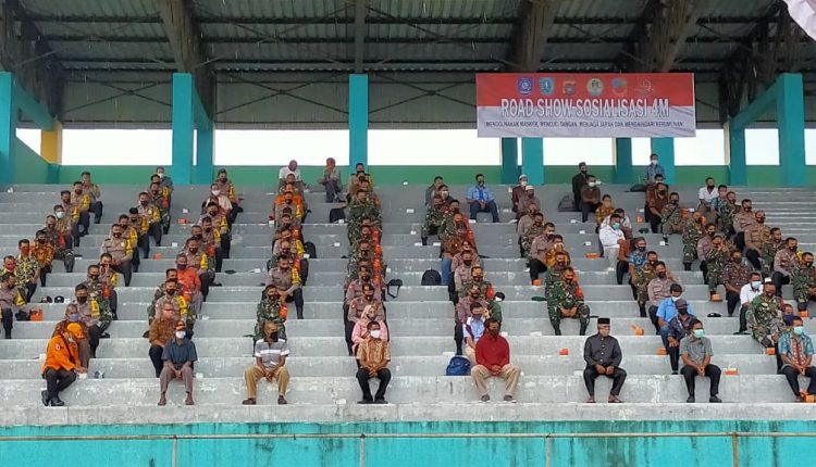 Tanjungpandan—. Danrem 045/Garuda Jaya Brigjen TNI M. Jangkung Widyanto, S.I.P., M.Tr.(Han). Road Show Sosialisasi tentang Pedoman Protokol Kesehatan 4M Kamis 08/10/2020 di Stadion Pakalalang Kecamatan Tanjungpandan Kabupaten Belitung.