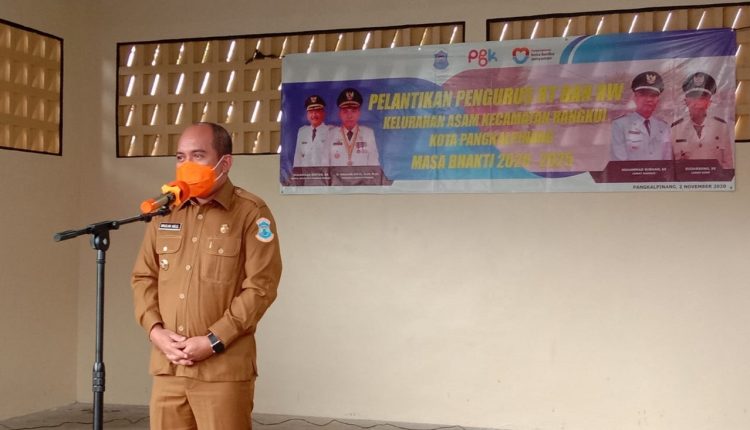 PANGKALPINANG — Walikota Pangkalpinang, Maulan Aklil menghadiri pelantikan pengurus RT dan RW Kelurahan Asam periode 2020-2025, di halaman Kantor Kelurahan Asam, Kecamatan Rangkui, Pangkalpinang, Senin (02/11/2020).