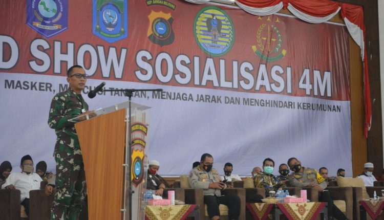 Koba — Danrem 045/Garuda Jaya sebagai pembicara tentang sosialisasi Protokol Kesehatan dalam kegiatan Road show sosialisasi 4 M yaitu menggunakan masker, mencuci tangan, menjaga jarak dan menghindari kerumunan di Gedung Serbaguna PemKab Bangka Tengah Koba Kamis 05/11/2020.