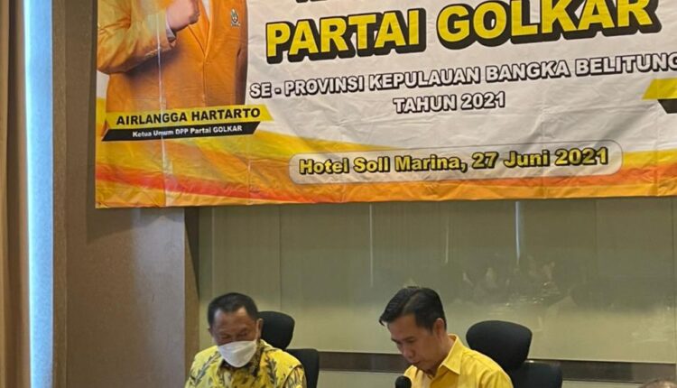 Pangkalpinang— Dewan Pimpinan Daerah (DPD) Partai Golongan Karya (Golkar) Provinsi Kepulauan Bangka Belitung (Babel) gelar Rapat Pimpinan Daerah Partai Golkar seluruh pengurus kabupaten/kota di Hotel Soll Marina, pada Minggu, 27 Juni 2021