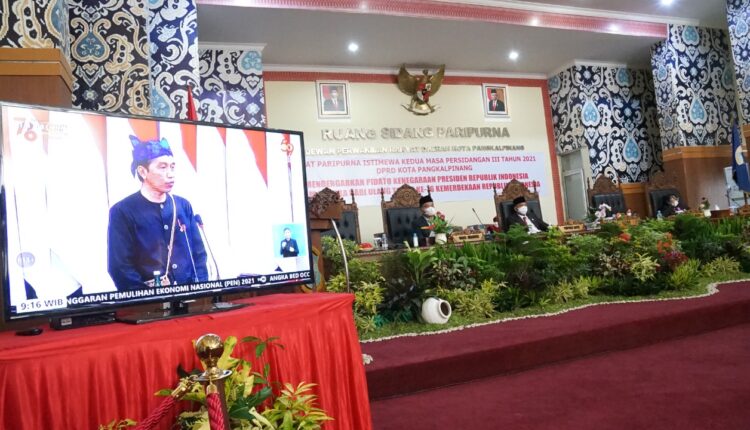Pangkalpinang — Wakil Wali Kota Pangkalpinang, Muhammad Sopian, menghadiri Rapat Paripurna Istimewa Kedua Masa Persidangan III Tahun 2021 dengan Agenda Mendengarkan Pidato Kenegaraan Presiden RI dalam Rangka Peringatan HUT Kemerdekaan ke-76 Republik Indonesia, di Ruang Sidang Paripurna DPRD Kota Pangkalpinang, Senin (16/8/2021)
