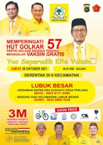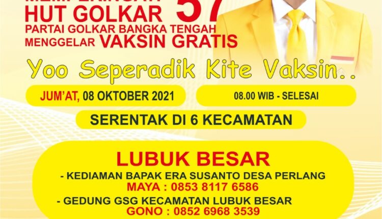 KOBA – Dewan Pimpinan Daerah (DPD) Partai Golongan Karya (Golkar) Kabupaten Bangka Tengah akan gelar Vaksinasi Covid-19 secara gratis dalam rangka Memperingati Hari Ulang Tahun (HUT) Partai Golkar yang ke-57 pada 8 Oktober 2021 mendatang.