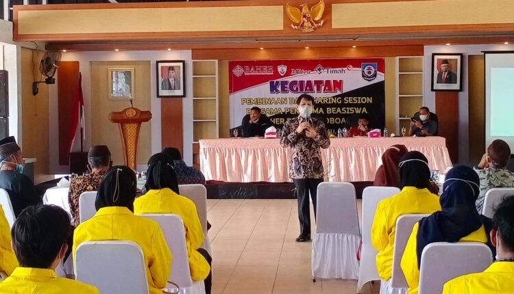 SATUARAHNEWS, TOBOALI — Tim Bangka Selatan Hame-hame Bergerak (Baher) bersama Wakil Bupati Bangka Selatan, Bunda Debby Vita Dewi melakukan kegiatan sharing sesion kepada 42 penerima Mahasiswa Baher pesisir Toboali, Kamis (14/10/21).