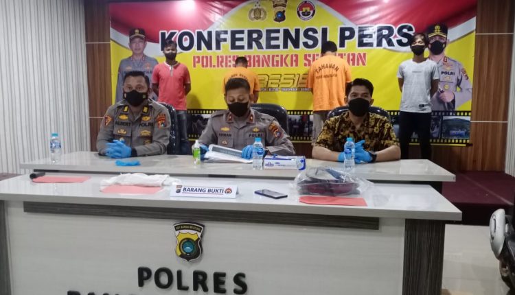 SatuArahNews, Toboali- Satreskrim Polres Bangka Selatan mengelar konferensi pers ungkap kasus tindak pidana pengeroyokan dan pembunuhan di tempat hiburan malam, Dusun Parit 9 Desa Gadung, Kecamatan Toboali, Kabupaten Bangka Selatan. Selasa ( 26/10/2021)