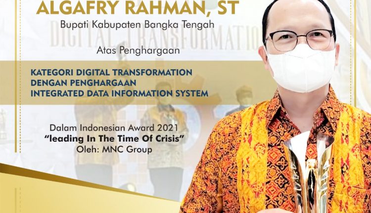 BANGKA TENGAH- Usai Bupati Bangka Tengah, Algafry Rahman menerima penghargaan Indonesia Award 2021 kategori Digital Transformation dengan penghargaan Integrated Data Information System (sistem informasi satu pintu) sebagai tokoh yang memberikan inspirasi dalam bidang digital transformation ditengah pandemi Covid-19.
