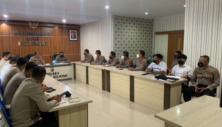 BANGKA SELATAN — Kapolres Bangka Selatan, AKBP Joko Isnawan, SIK, MH memimpin Rapat Pengamanan Pemilihan Kepala Desa Serentak Tahun 2021 di Ruang Briefing Polres Bangka Selatan, Senin (06/12/2021).