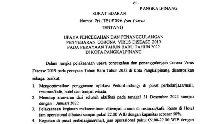 Dalam rangka pelaksanaan upaya pencegahan dan penanggulangan Corona Virus Disease 2019 pada perayaan Tahun Baru Tahun 2022 di Kota Pangkalpinang, disampaikan sebagai berikut: