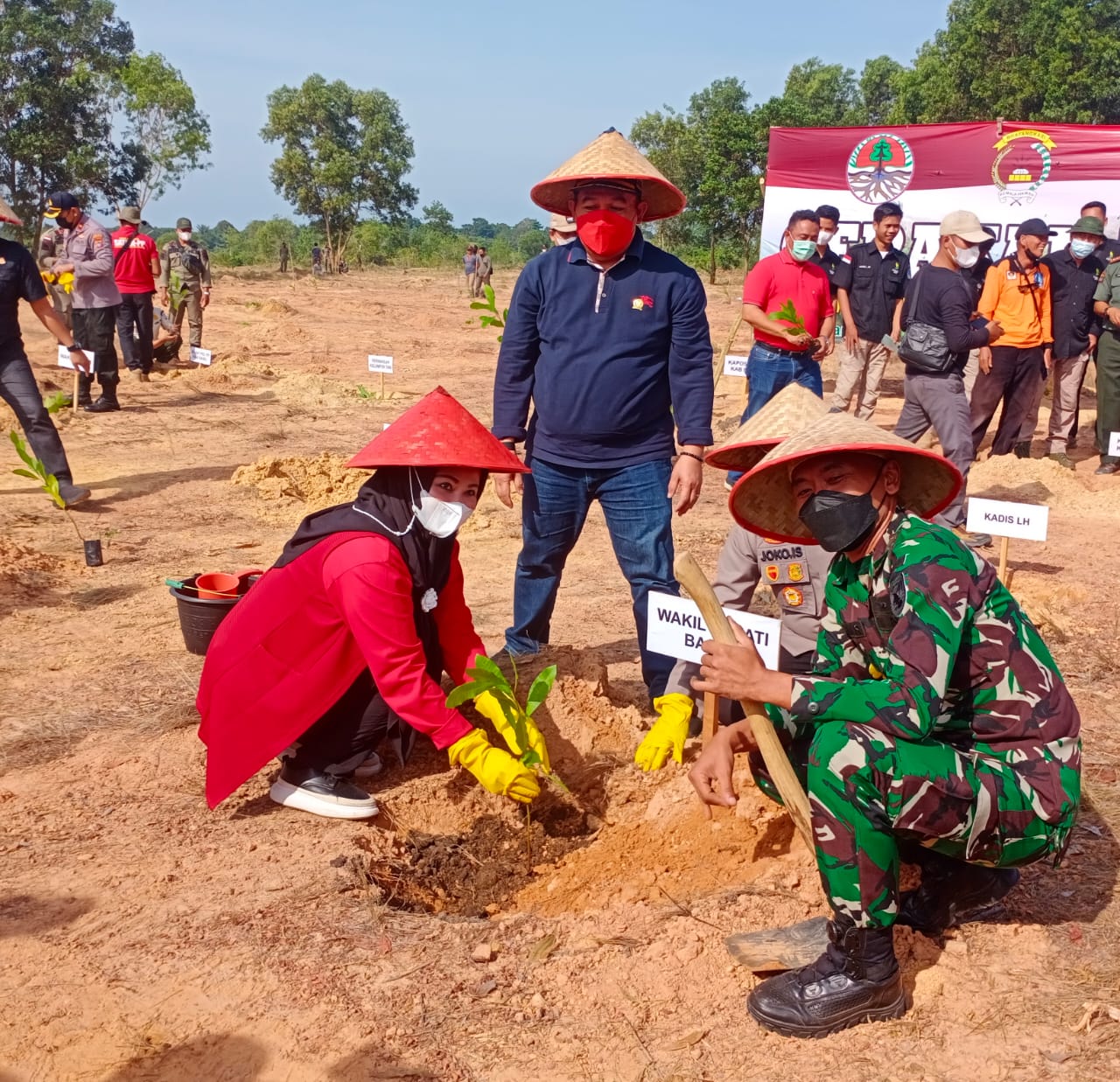 Wakil Bupati Bangka Selatan Debi Vita Dewi, beserta Kapolres, AKBP Joko Isnawan dan Pabung Kodim 0413/BKA Mayor Kavaleri Amar Wahyudi secara serentak menanam 1.200 bibit jambu mente di lahan seluas 5 Hektar di lahan pasca eks tambang
