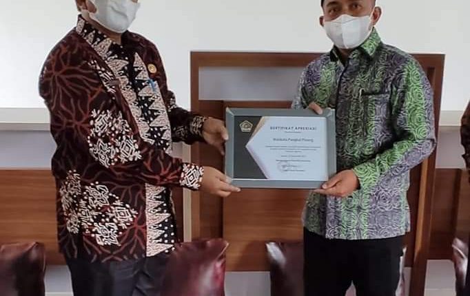 PANGKALPINANG — Wali Kota Pangkalpinang Maulan Aklil mendapatkan penghargaan berupa Sertifikat Apresiasi dari Kementerian Agama RI yang ditandatangani oleh Menteri Agama RI Yaqut Cholil Qoumas, di Kementerian Agama RI Kantor Kota Pangkalpinang, Kamis (10/3/2022).