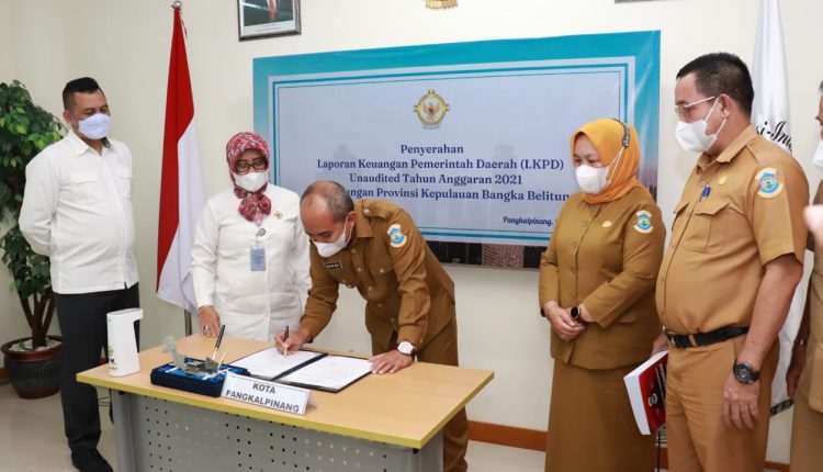 PANGKALPINANG – Wali Kota Pangkalpinang Maulan Aklil menyerahkan langsung secara simbolis Laporan Keuangan Pemerintah Daerah (LKPD) unaudited Pemerintah Kota Pangkalpinang tahun anggaran 2021 kepada Kepala Perwakilan BPK Provinsi Kepulauan Bangka Belitung Ida Farida, di kantor BPK RI Perwakilan Provinsi Kepulauan Bangka Belitung, Senin (21/3/2022)