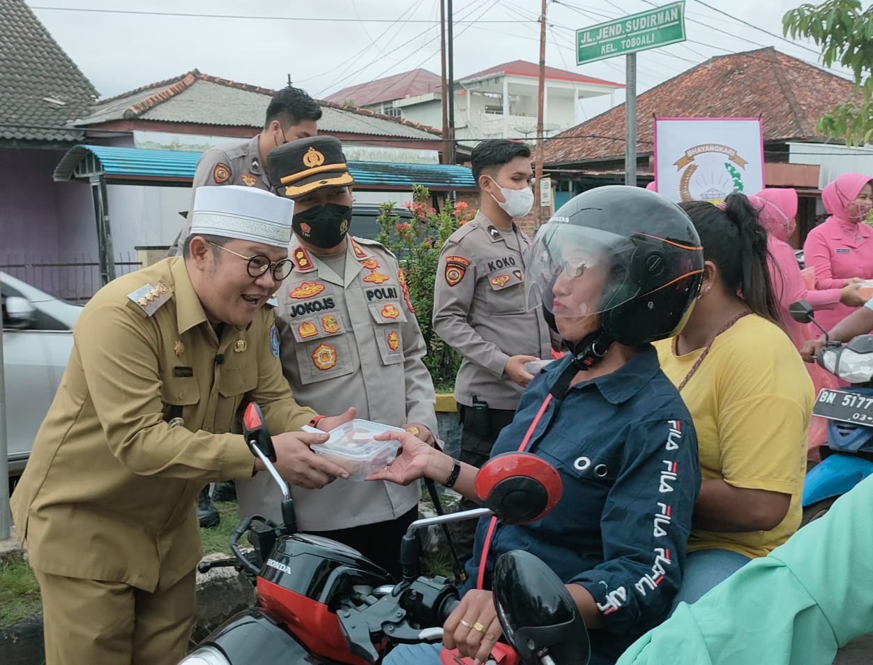 Ribuan menu takjil buka puasa dibagikan kepada masyarakat yang melintas di jalan Jenderal Sudirman Kecamatan Toboali pada Selasa(19/4/2022) Sore.