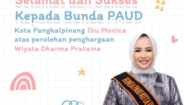 PANGKALPINANG — Bunda PAUD (Pendidikan Anak Usia Dini) Kota Pangkalpinang, Monica Haprinda menerima penghargaan Wiyata Dharma Pratama dari Kementerian Pendidikan, Kebudayaan, Riset dan Teknologi. Penerima apresiasi Bunda PAUD tingkat nasional ini diterima berdasarkan surat keputusan menteri pada akhir Mei 2022 lalu.