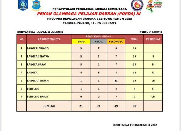 PANGKALPINANG — Kontingen Kota Pangkalpinang, meraih peringkat pertama perolehan medali sementara pada Kejuaraan Pekan Olah Raga Pelajar Daerah (Popda) XI, Provinsi Kepulauan Bangka Belitung (Babel) tahun 2022, pada Jumat, (22/7/2022).
