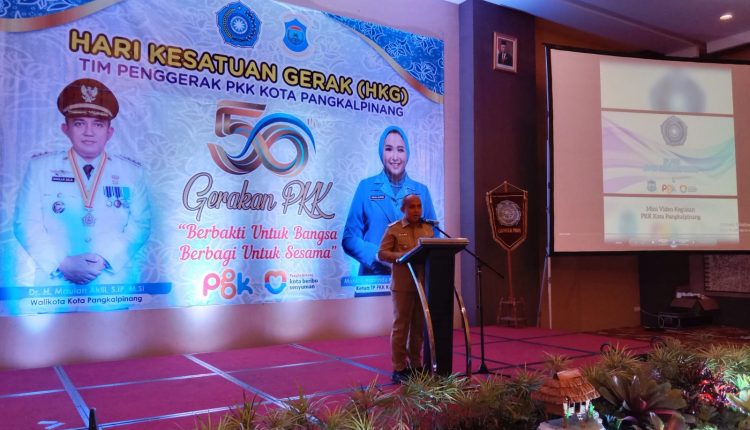 PANGKALPINANG – Tim Penggerak Pemberdayaan Kesejahteraan Keluarga (TP PKK) Kota Pangkalpinang meriahkan Hari Kesatuan Gerak (HKG) ke-50 tahun di Ballroom Swiss-belhotel Kota Pangkalpinang, Selasa (4/10/2022). HKG tersebut dihadiri Wali Kota Pangkalpinang, Dr. H. Maulan Aklil bersama jajaran pejabat, kepala Organisasi Perangkat Daerah (OPD), Camat hingga Lurah di lingkungan Pemerintah Kota Pangkalpinang.