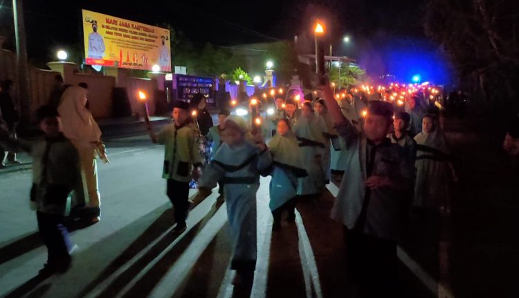 Pawai obor yang digelar oleh Mahasiswa KKN IAIN Sas Babel tersebut diikuti ratusan anak anak pelajar tingkat MA Ponpes Al-Hidayah, TPA dan SD.