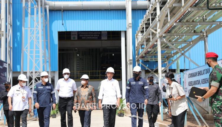 MUNTOK – Presiden Joko Widodo bersama Penjabat (Pj) Gubernur Kepulauan Bangka Belitung (Kep. Babel) Ridwan Djamaluddin, meninjau pembangunan _Top Submerged Lance (TSL) Ausmelt_ yang dikerjakan oleh PT Timah Tbk di Muntok, Kabupaten Bangka Barat, Kamis (20/10/22).