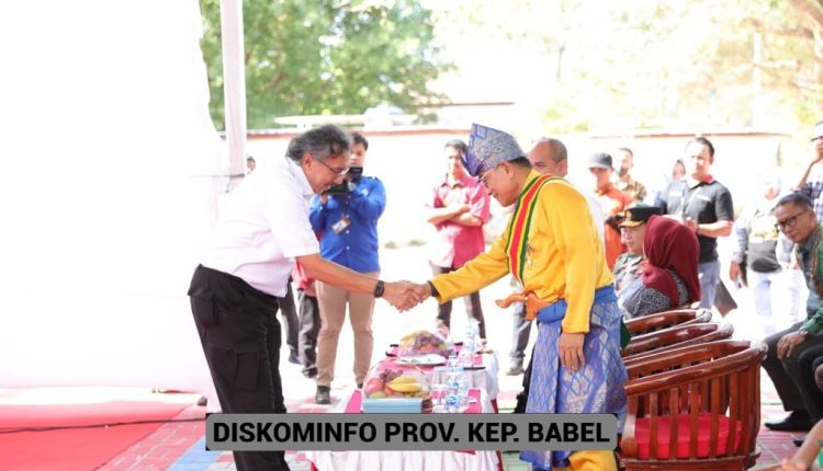PANGKALPINANG – Penjabat (Pj) Gubernur Kepulauan Bangka Belitung (Kep. Babel) Ridwan Djamaluddin bersama Kepala Staf Kepresidenan (KSP) Moeldoko menghadiri kegiatan Penabalan (pemberian) Gelar Adat kepada Kepala Staf Kepresidenan (KSP) Moeldoko dan Peresmian Fasilitas amenitas Pantai Pasir Padi, di Kawasan Wisata Pantai Pasir Padi, Jumat (13/1/2023) siang.