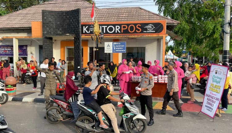 SatuArahNews, Toboali- Kepolisian Sektor (Polsek) Toboali Kabupaten Bangka Selatan membagikan 100 paket takjil kepada warga dan pengendara yang melintas di seputaran area Pendestrian Himpang 5 Habang.