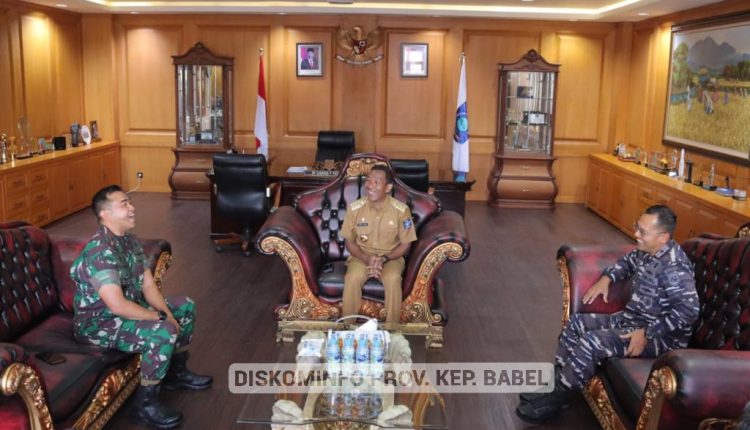 PANGKALPINANG – Penjabat (Pj) Gubernur Kepulauan Bangka Belitung (Kep. Babel) Suganda Pandapotan Pasaribu, menerima kunjungan kerja Komandan Gugus Tempur Laut (Danguspurla) Koarmada I Laksamana Pertama Heri Triwibowo, serta Komandan Resor Militer (Danrem) 045 Garuda Jaya Brigjen TNI Agustinus Dedi Prasetyo, di ruang kerja Gubernur, Selasa (2/5/2023).