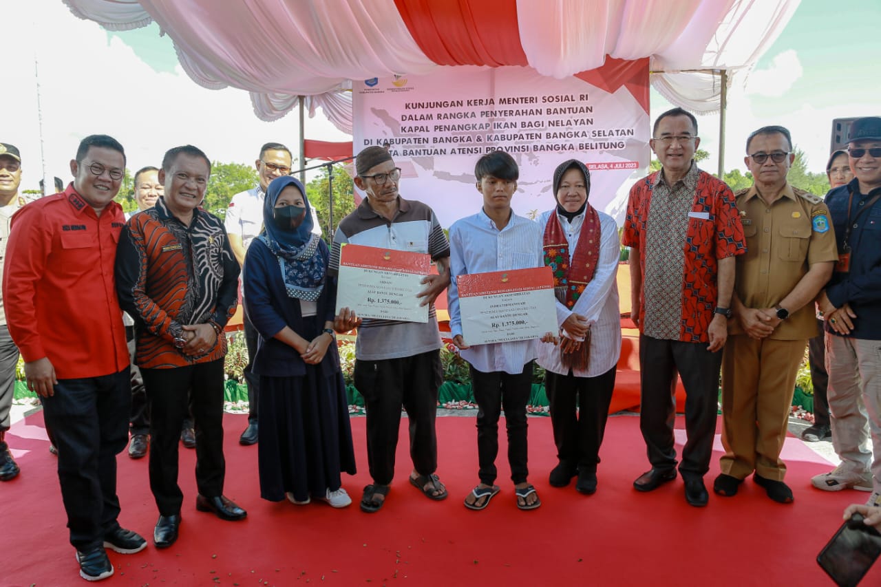 ” Kami menyerahkan bantuan 26 unit kapal tangkap ikan 5 GT (Gross Tonage) senilai Rp. 6.743.102.250. Semoga bantuan ini dapat membantu ekonomi sekaligus bisa meningkatkan hasil tangkap para nelayan di wilayah Bangka Selatan,” kata Mensos RI Tri Rismaharini.