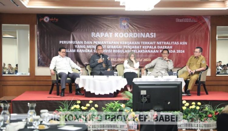 JAKARTA-Usai mengikuti kegiatan Rapat Koordinasi Perumusan dan Pemantapan Kebijakan Terkait Netralitas ASN yang Menjabat Sebagai Penjabat Kepala Daerah Dalam Rangka Supervisi Regulasi Pelaksanaan Pilkada 2024 di Hotel Millenium Jakarta, Penjabat (Pj) Gubernur Kepulauan Bangka Belitung (Babel), Suganda Pandapotan Pasaribu langsung membuka kegiatan Rapat Koordinasi Pj Gubernur dengan Kepala Desa se-Provinsi Kepulauan Bangka Belitung melalui Zoom Meeting, Senin (17/7/23).