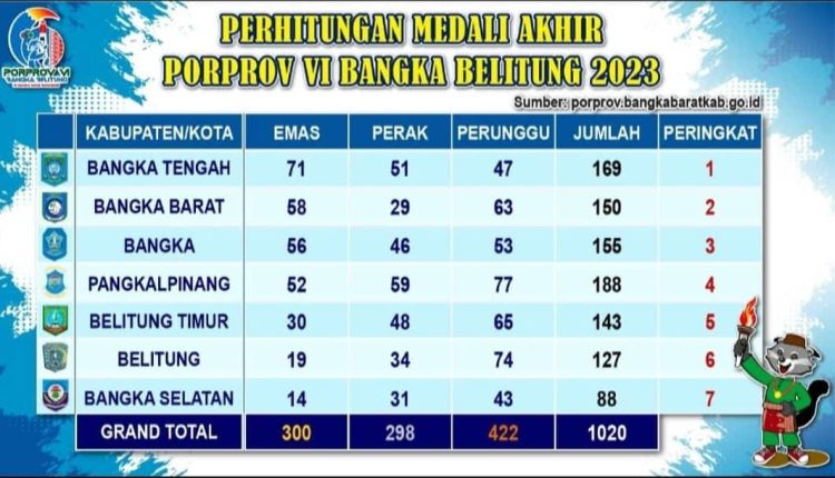 Diurutan pertama, Kabupaten Bangka Tengah berhasil mengumpulkan 71 emas, 51 perak, 47 perunggu dengan jumlah keseluruhan 169 mendali.