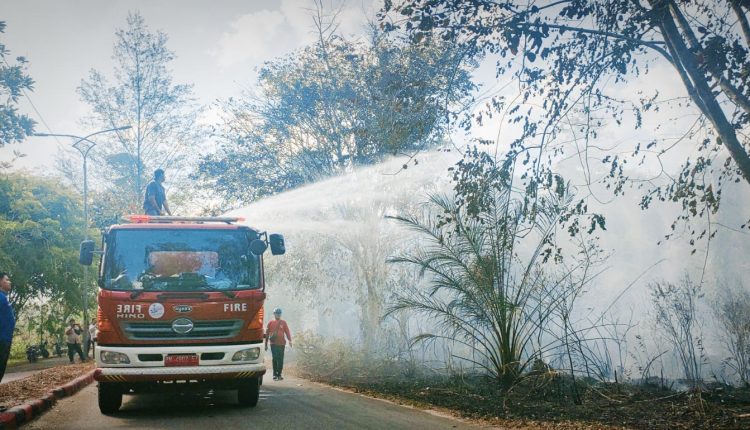 SatuArahNews, TOBOALI- Petugas pemadam kebakaran Kabupaten Bangka Selatan berjibaku menjinakkan kobaran api yang melalap hutan di area jalur dua kantor Pemkab Basel, Rabu (13/09/2023).