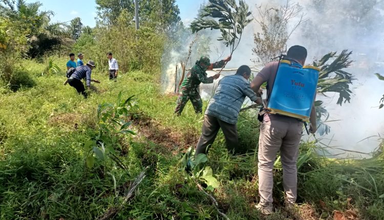Payung – Anggota Koramil 432-02 / Payung bersama warga setempat membantu padamkan api saat terjadi kebakaran lahan di Dusun Mekar Jaya Kecamatan Payung Kabupaten Bangka Selatan,Payung (27/9/2023).
