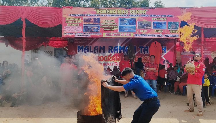 SatuArahNews,TOBOALI- Petugas pemadam kebakaran (Damkar) Kabupaten Bangka Selatan memperagakan simulasi cara memadamkan api menggunakan Karung Goni Basah kepada masyarakat dan pelajar yang ada di wilayah Desa Serdang Kecamatan Toboali.