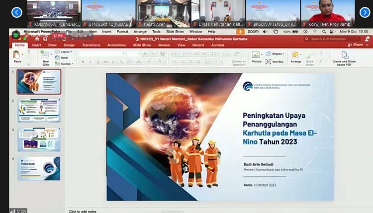 PANGKALPINANG – Untuk mengetahui perkembangan kebakaran hutan dan lahan (karhutla) sejak bulan Juli tahun 2023 yang cukup masif terutama di wilayah rawan karhutla, Menteri Koordinator Bidang Politik, Hukum dan Keamanan (Menkopolhukam) Mahfud MD, meminta kepada seluruh Kementerian/ Lembaga, Panglima TNI dan Kapolri, Kepala Daerah, Pangdam, Danrem, Kapolda, untuk melaporkan secara langsung _update_ status keadaan tiap daerahnya terkait dengan kasus karhutla yang sekarang sedang marak. Tak terkecuali Penjabat (Pj) Gubernur Provinsi Kepulauan Bangka Belitung, Suganda Pandapotan Pasaribu yang hadir secara daring. Pada kesempatan ini, Menkopolhulkam meminta agar segenap unsur bekerja sama untuk menanggulangi karhutla. Hal ini dikatakannya ketika memimpin langsung Rakorsus Penanggulangan Kebakaran Hutan dan Lahan Tahun 2023 di Gedung Manggala Wanabakti Jakarta, Senin (9/10/2023)