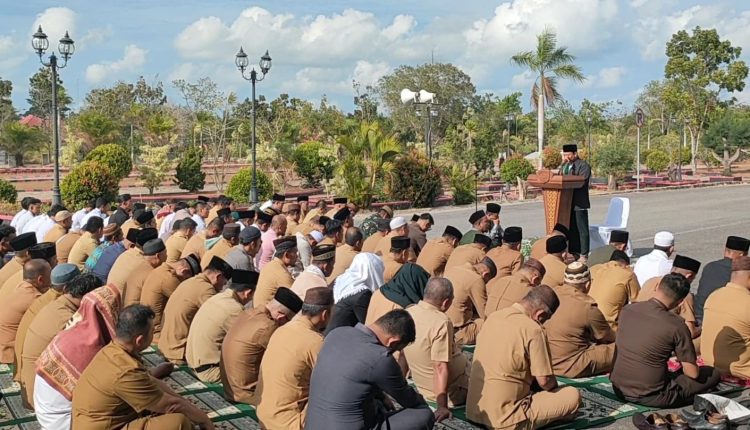SatuArahNews, TOBOALI- Pemerintah Kabupaten Bangka Selatan menggelar Sholat Istisqa berjamaah atau meminta hujan di halaman depan Kantor Bupati Basel, Senin (16/10/2023).
