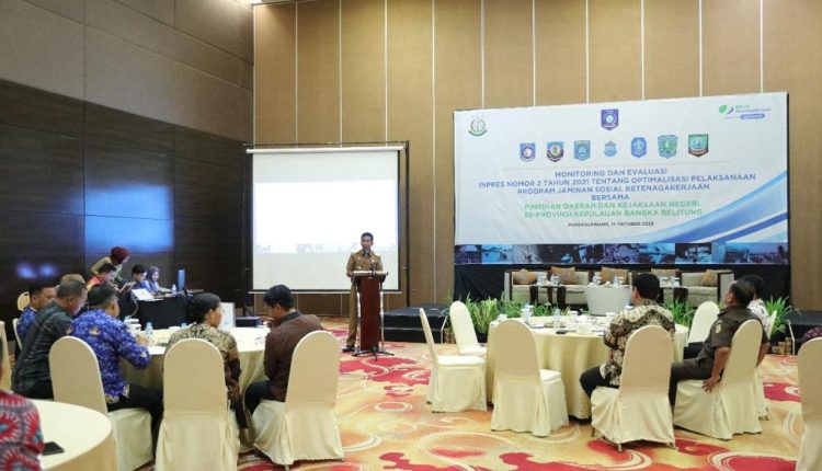 PANGKALPINANG – Penjabat (Pj) Gubernur Bangka Belitung (Kep. Babel) Suganda Pandapotan Pasaribu, berkesempatan membuka kegiatan Monitoring Evaluasi Instruksi Presiden Nomor 2 Tahun 2021, bersama Kejaksaan Tinggi (Kejati) Babel yang digelar BPJS Ketenagakerjaan, di Hotel Soll Marina, Pangkalanbaru, Kabupaten Bangka Tengah, Selasa (17/10/2023).