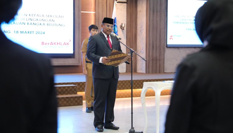 PANGKALPINANG- Penjabat (Pj) Gubernur Kepulauan Bangka Belitung (Kep Babel) Safrizal ZA melantik sebanyak 17 orang Kepala Sekolah dan 6 Pengawas Sekolah yang menjadi kewenangan Pemerintah Provinsi Kepulauan Bangka Belitung di Ruang Rapat Pasir Padi, Senin 28/3/2024.