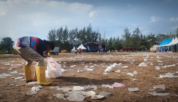 TOBOALI- Pemerintah Kabupaten Bangka Selatan melalui Dinas Lingkungan Hidup mulai membersihkan sampah sisa-sisa konser musik di kawasan Sport Center Pemkab Bangka Selatan.