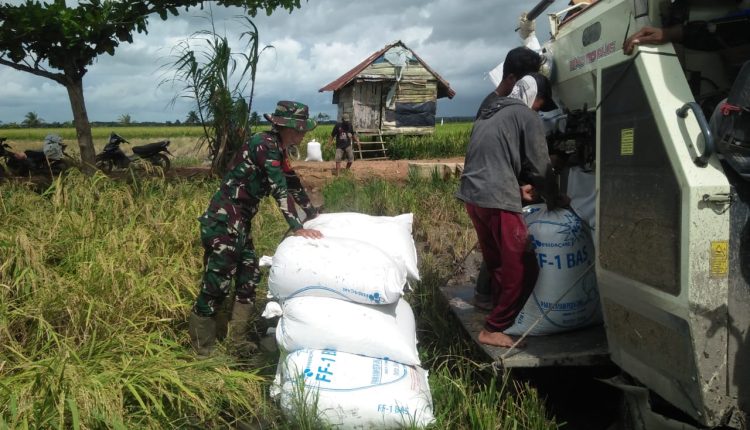 TOBOALI- Babinsa Koramil 0432 Bangka Selatan membantu para petani Dusun Tangit Desa Serdang memanen padi seluas 24 hektar di Dusun Tangit Desa Serdang, sebagai upaya mendukung program swasembada pangan nasional Bangka Belitung.