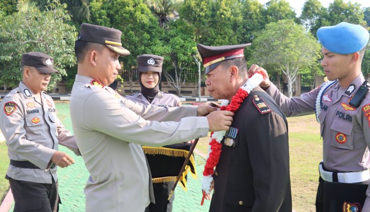 TOBOALI- Kepolisian Resor (Polres) Kabupaten Bangka Selatan Kepulauan Bangka Belitung menggelar upacara purna bakti untuk AKP Ekhard Rustam di halaman Mapolres Basel,