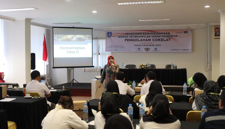 PANGKALPINANG – Penjabat (Pj) Ketua TP PKK Provinsi Kepulauan Bangka Belitung (Kep. Babel) Saftriati Safrizal menghadiri dan memberikan motivasi pada kegiatan Pelatihan Kewirausahaan Bidang Keterampilan Usaha Produktif Angkatan I Pengolahan Cokelat di Sun Hotel Pangkalpinang pada Senin (27/5/2024).