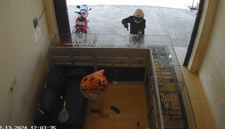 Kejadian perampokan yang sempat terekam kamera CCTV toko tersebut, memperlihatkan 1 dari 2 pelaku turun dari sepeda motor jenis matic secara cepat menggasak sejumlah emas dengan memecahkan etalase kaca diduga mengguna sebuah palu.