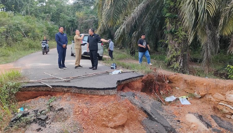 TOBOALI- Dua Anggota Dewan Perwakilan Rakyat Daerah (DPRD) Kabupaten Bangka Selatan dari Partai Demokrat mengecek tiga titik jalan putus yang berada di Desa Keposang, Kecamatan Toboali, Senin (30/9/2024).