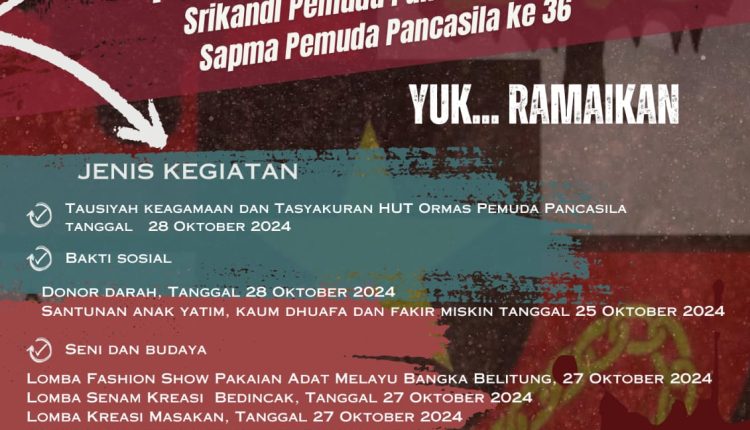 Dalam rangka peringatan Hari Ulang Tahun (HUT) Pemuda Pacasila yg ke 65 tahun, HUT Srikandi Pemuda Pancasila Ke 41 Tahun seta HUT SAPMA Pemuda Pancasila Ke 36 Tahun ini Majelis Pimpinan Wilayah (MPW) Pemuda Pancasila Provinsi Kepulauan Bangka Belitung (Babel) menyelenggarakan berbagai kegiatan.