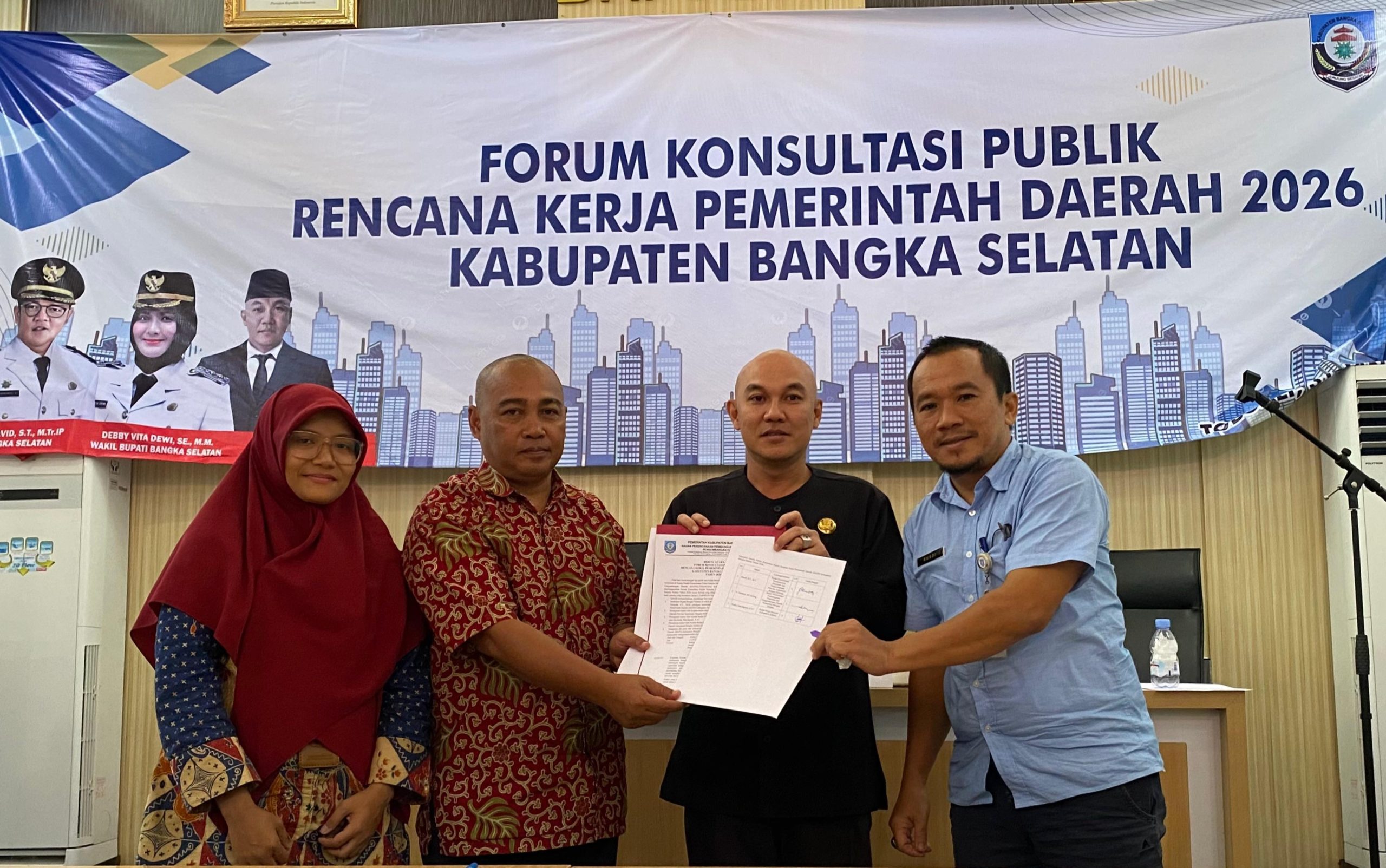 Bupati Bangka Selatan Riza Herdavid mengatakan, kegiatan konsultasi publik ini bertujuan untuk menjaring informasi dari berbagai pemangku kebijakan dan serta berbagai masukan yang konstruktif guna perumusan dan penyusunan RKPD Bangka Selatan tahun 2026.