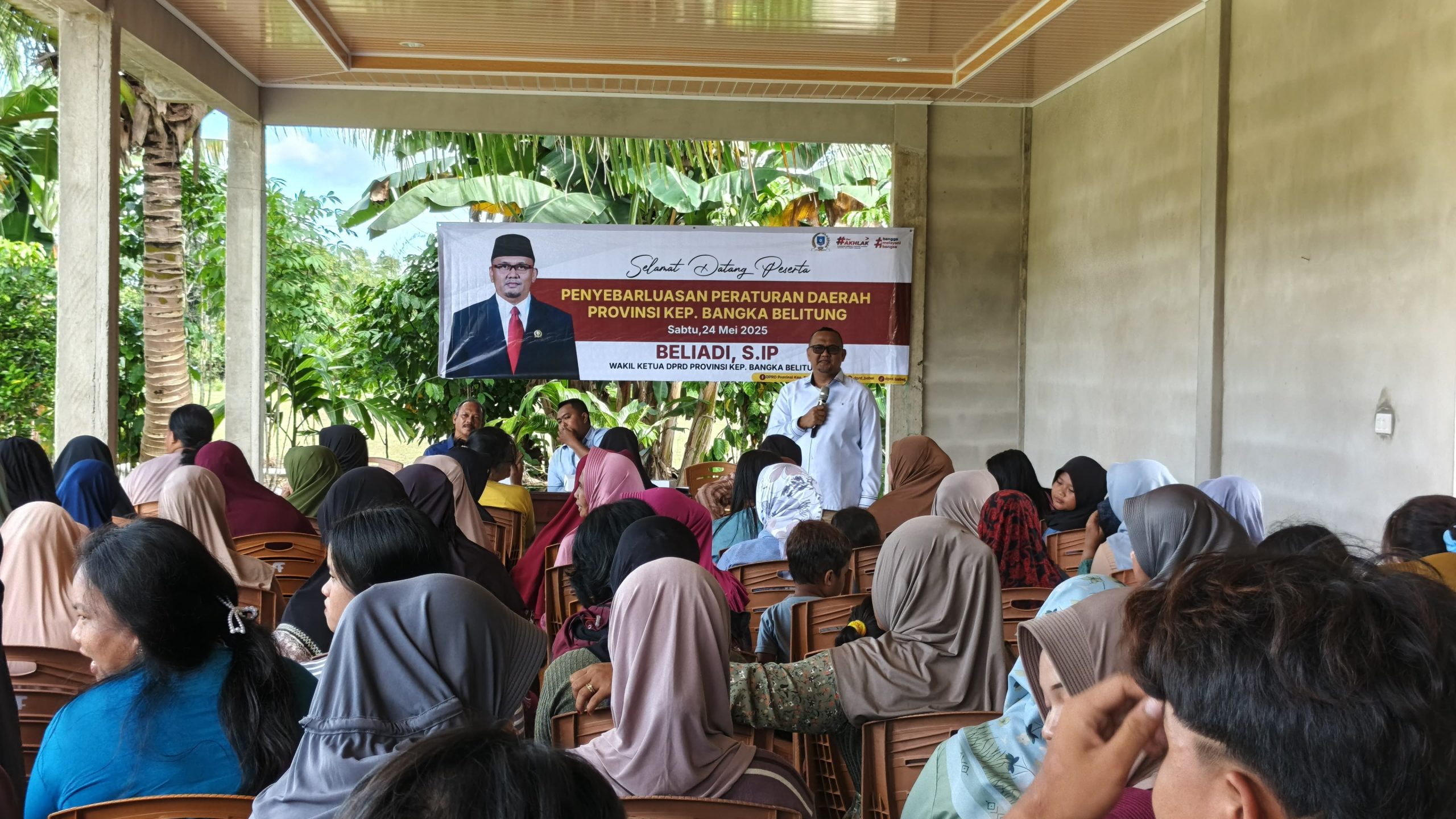 GANTUNG — Wakil Ketua DPRD Provinsi Kepulauan Bangka Belitung, Beliadi melaksanakan kegiatan penyebarluasan Peraturan Daerah Nomor 3 Tahun 2024 tentang Penyelenggaraan Kesejahteraan Sosial di Desa Lilangan, Kecamatan Gantung, Kabupaten Belitung Timur, pada Sabtu (24/5). Kegiatan ini disambut antusias oleh masyarakat setempat yang hadir dalam jumlah besar.