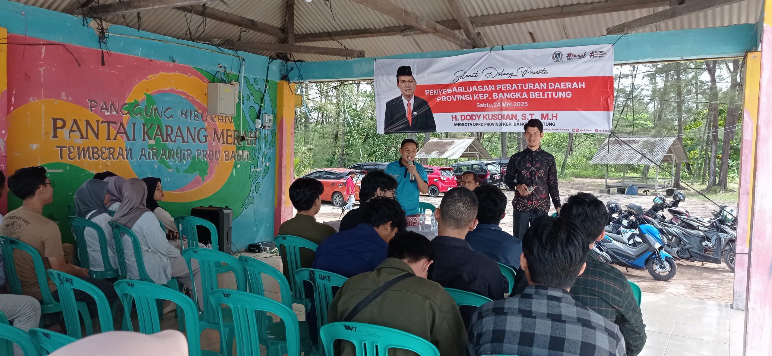Merawang – Dalam semilir angin pantai Temberan, Desa Air Anyir, Kabupaten Bangka, Sabtu (24/05/2025), Ketua Komisi II DPRD Provinsi Kepulauan Bangka Belitung, Dody Kusdian mensosialisasikan Peraturan Daerah (Perda) Nomor 13 Tahun 2016 tentang Keolahragaan kepada mahasiswa dan masyarakat.