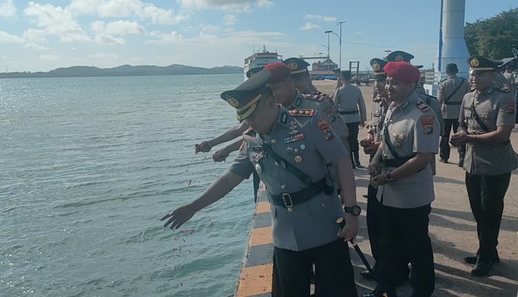 TOBOALI- Kepolisian Resor (Polres) Kabupaten Bangka Selatan melaksanakan upacara tabur bunga di Dermaga Desa Sadai Kecamatan Tukak Sadai Bangka Selatan dalam rangka memperingati hari Bhayangkara ke-79 tahun, Senin (23/06/2025).