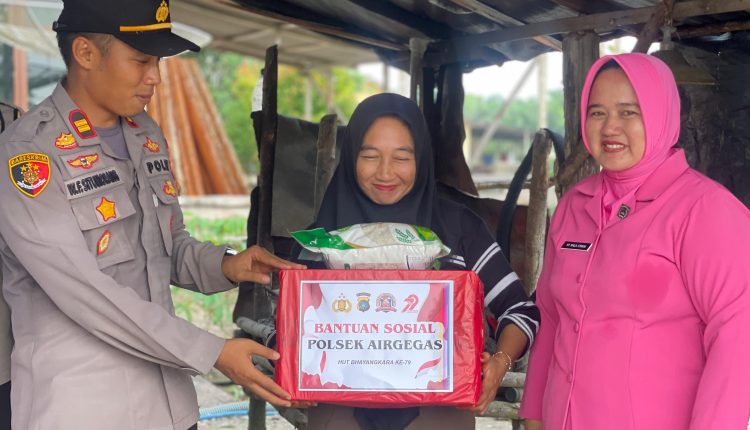 Kapolsek Air Gegas Iptu William situmorang mengatakan dalam momentum hut bhayangkara ke 79 polri, Polsek membagikan sembako kepada warga yang kurang mampu.