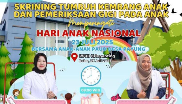 Satuarahnews.com – Dalam rangka memperingati Hari Anak Nasional (HAN), Rumah Sakit Umum Daerah (RSUD) Kriopanting Payung, Kabupaten Bangka Selatan, akan menyelenggarakan kegiatan skrining tumbuh kembang anak dan pemeriksaan gigi gratis.