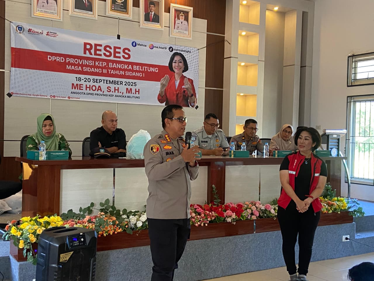 PANGKALAN BARU– Wakil Ketua Komisi IV DPRD Provinsi Kepulauan Bangka Belitung (Babel) dari Daerah Pemilihan (Dapil) Bangka Tengah, Me Hoa menggelar kegiatan reses di SMKN 1 Pangkalanbaru, Kabupaten Bangka Tengah, Kamis (18/9/2025).